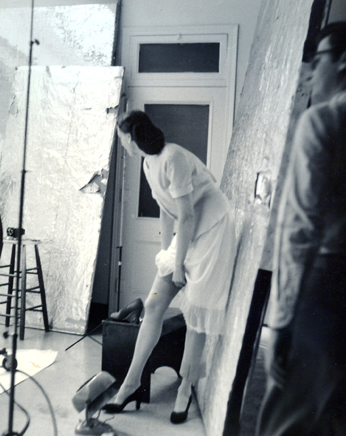 “The photo below shows a leg model preparing for a hosiery shot under the skylight at 640 Madison Ave., circa 1953. Avedon is on the right.”