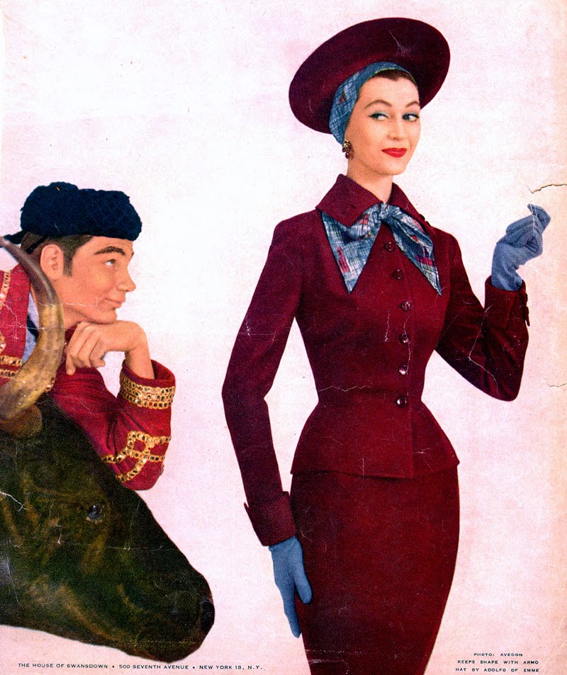 “That’s me playing matador with a fake bull. This was part of a fashion ad with my head between the horns, ogling Dovima the model. The final result is below. The fashions are very 1953.”