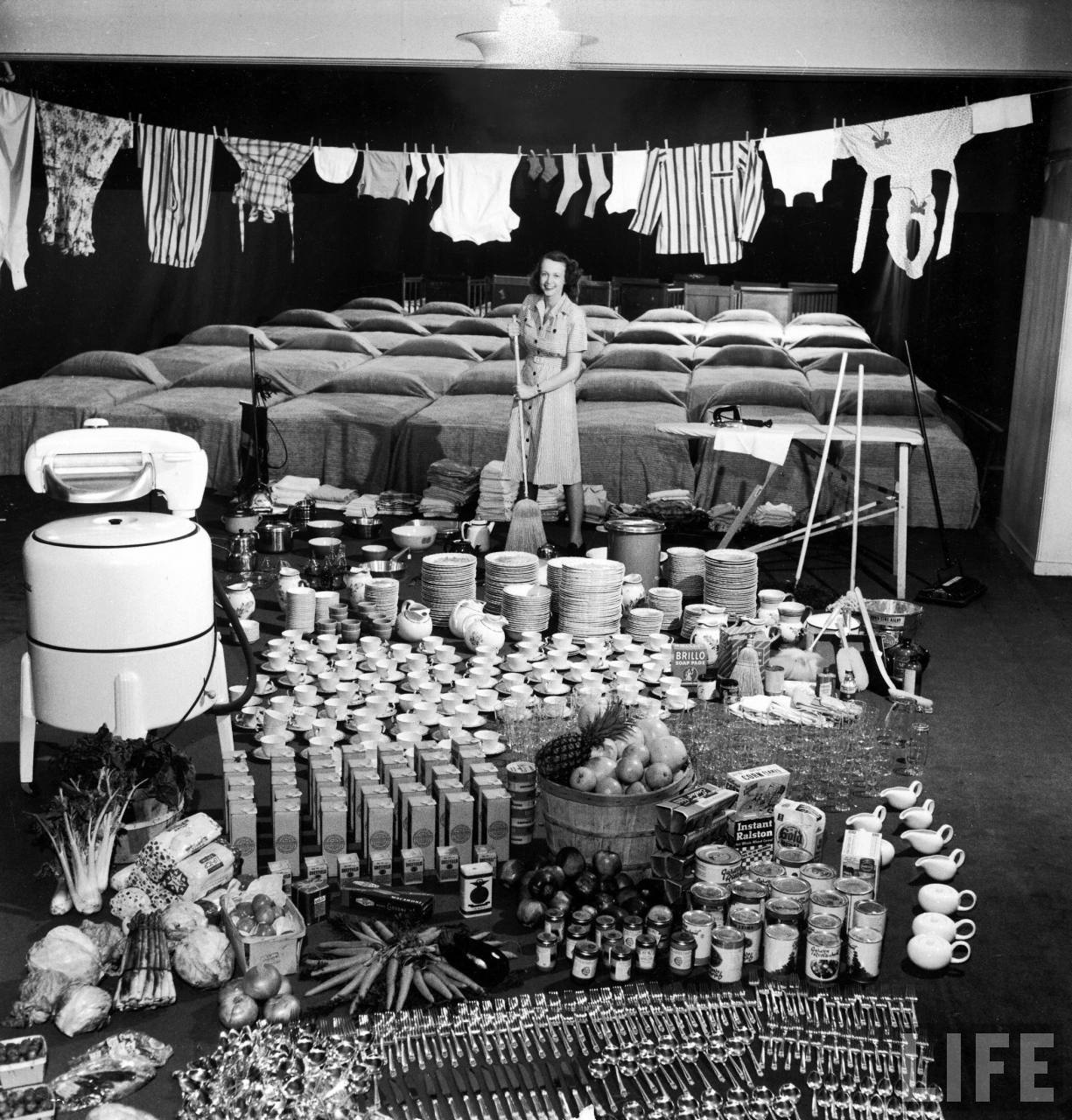 Housewife Marjorie McWeeney stands amongst a symbolic display of a full week’s housework for a typical 1940’s housewife. Labour includes 35 beds to be made, 750 items of glass & china, 400 pieces of silverware to wash, 174 lbs. of food to prepare, and 250 pieces of laundry.