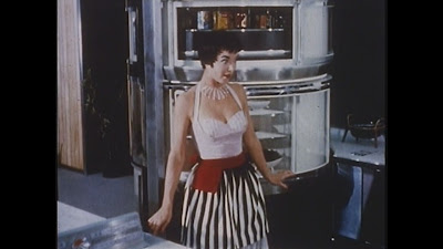 Of course this film depicts the fantasy kitchen, as envisioned at the time – funny how we’ve all gone ” old world ”  again, now that the future is here ! .In the actual 1950’s kitchen of the period, popular colors were pastel shades like pink, aqua and turquoise in tiling, walls, curtains.Tupper wear was everywhere of course – plastic again !