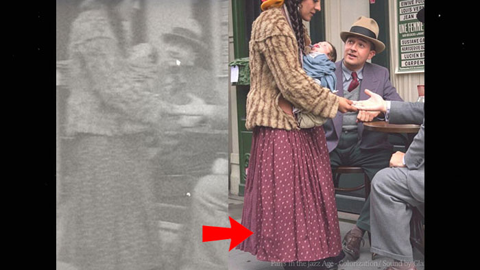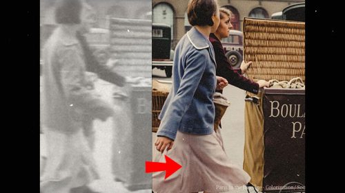 The original footage showed her as just another shadowy figure. But in colour, you can see the warm tones of her coat, the delicate burgundy pattern of her skirt, and—if you look closely—the weary determination in her posture. This wasn’t a wealthy Parisian; this was a working mother, probably on her way to or from the market, juggling motherhood and survival in a city that was equal parts glamour and grit.